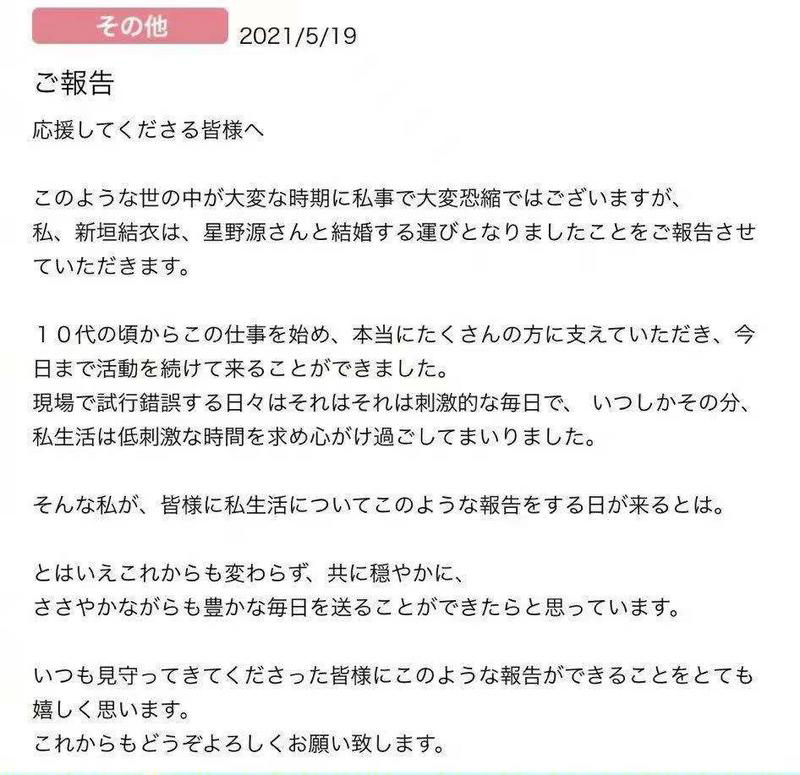 新垣结衣(日语:新垣 結衣/あらがき ゆい aragaki yui,1988年6月11日-)是日本女演员、歌手及模特儿,出生于冲绳县那霸市,身高169厘米,血型a型,目前为日本lespros娱乐旗下艺人。 新垣. #星野源发文# :一直以来支持我的各位,大家好。 我是星野源,在这个非常艰难的时期,因为私事非常抱歉,这次,我星野源要和新垣结衣结婚了。 希望今后也能互相扶持,积累丰富的时间。 虽然是两个不成熟的人.